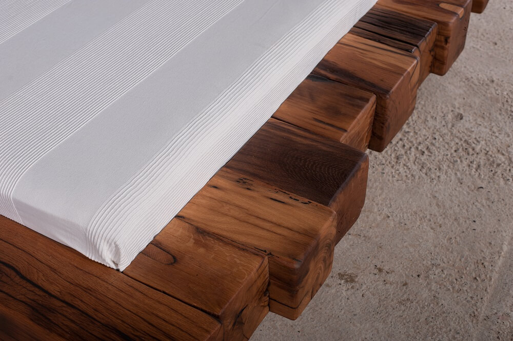 מיטה זוגית מיוצרת מעץ אלון מחודש בן 100+ שנים בסגנון להבה למראה עתיק ואקזוטי. המיטה מוגבהת ליצירת מראה צף ונקי